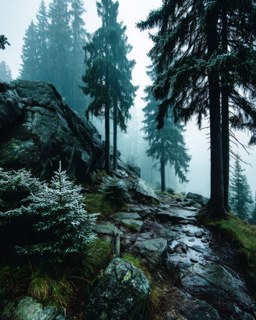 A path winds through a misty forest filled with tall trees and rocky ground. The scene shows tree trunks and fog, creating a quiet outdoor space in nature.