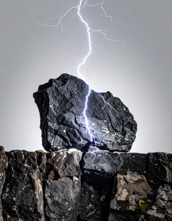 A brilliant flash of lightning descends from a stormy sky, striking a solid boulder with immense force. The raw, electric energy visibly cracks the stone, capturing a dramatic moment of impact. This image symbolizes a powerful breakthrough, a sudden revelation, or the point where resilience meets an unstoppable force.