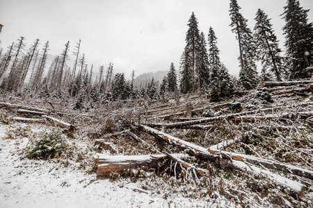Landscape snow trees and felled trees forest in winter. mountains in the background. Morske Oko