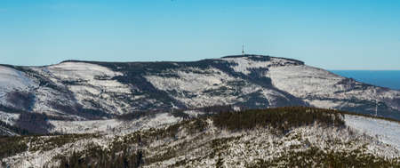 KARPACZ, POLAND - MARCH 08, 2020: Snezka or Sniezka (in Czech and Polish) is a mountain on the border between the Czech Republic and Poland, Karkonosze National Park, Poland, Europe.