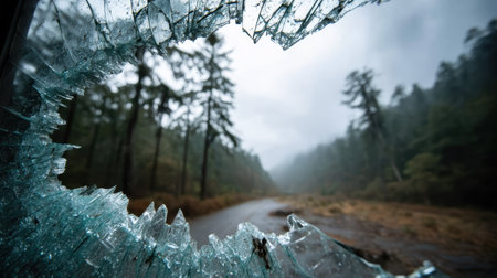 Cracked and shattered mirror glass with sharp shards reflecting fragments of light, dramatic mood.