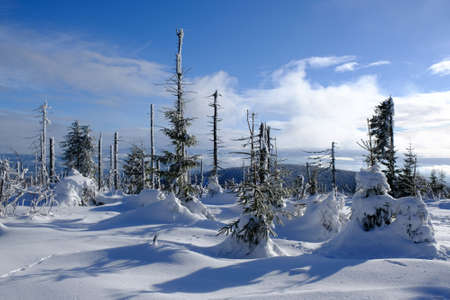 Windbreaks and withered spruce trees attacked by the spruce bark beetle in the Nature Reserve on Policy in winter scenery. Beskid Zywiecki, Poland
