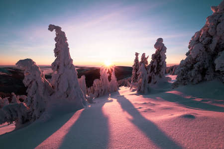 Sunshine under the winter calm mountain landscape with beautiful fir trees on slope at Feldberg Mountain in Hesse, Germany