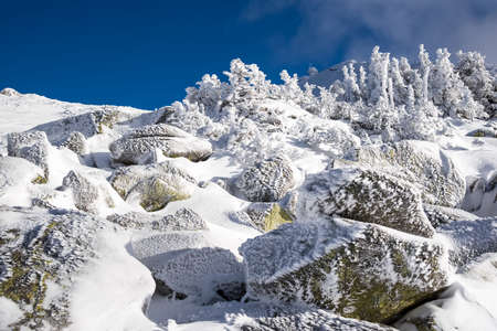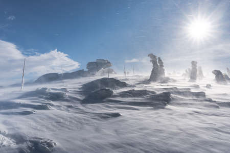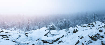 Viewpoint Trojmorski Wierch, rocks covered with snow. Low visibility due to fog in the valley. Snowfall covered the hiking trail leading to the top of the Trojmorski Wierch mountain