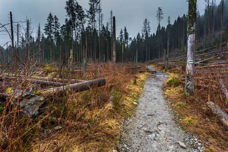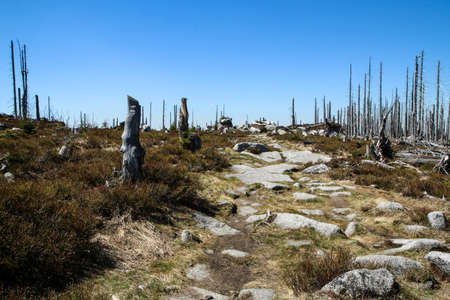 The hiking trail made of stones at Å umava national park in Czech Republic. The forest is damaged by the hurricane and left to revitalize naturally.