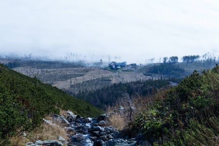 View after the mountain wind of The Bialki valley in the Tatra Mountains near Zakopane. A hazy spring day. Stone path.