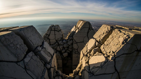 An aerial view of a large concrete structure broken into sharp angular pieces with a vast landscape visible in the background.