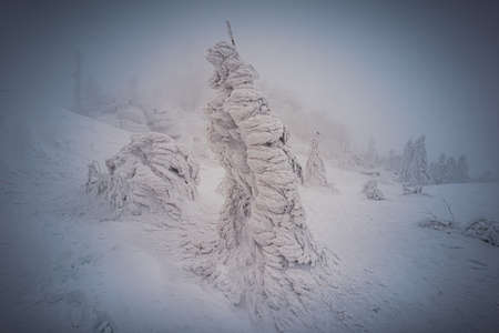 Winter landscape. The peak of Sniezka, Karkonosze Mountains on the border of Poland and the Czech Republic. Black and white.