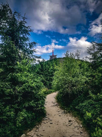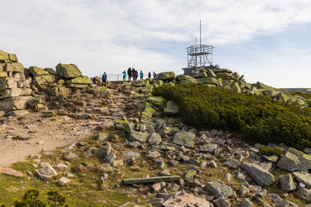 Giant Mountains, Poland - November 2022: Beautiful stony hill full of big rocks and small view point on top with small metal tower