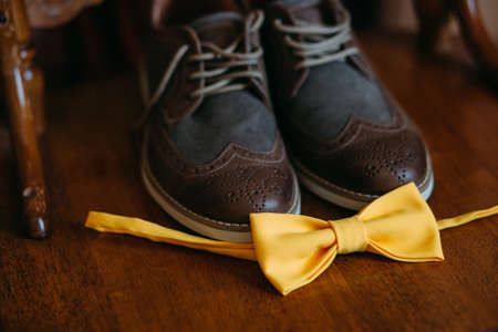 Brown bow tie, leather shoes and belt. Grooms wedding morning. Close up of modern man accessories
