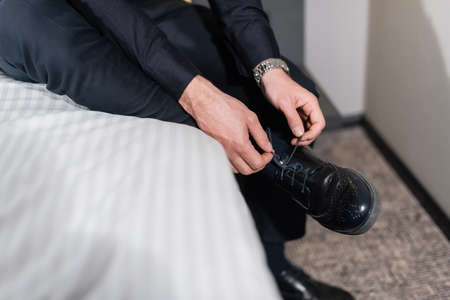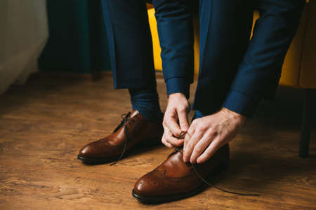 A man in a blue suit ties up shoelaces on brown leather shoes brogues on a wooden parquet background