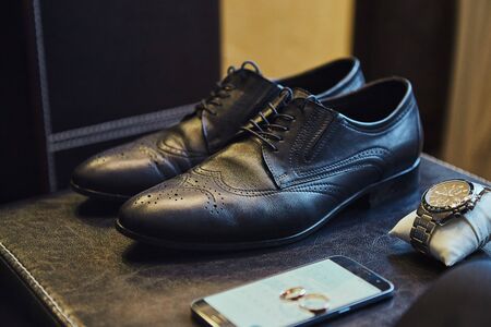 The groom is gathering in the morning. Men's classic patent leather shoes. A bow tie. Wedding details. Watch with leather strap.