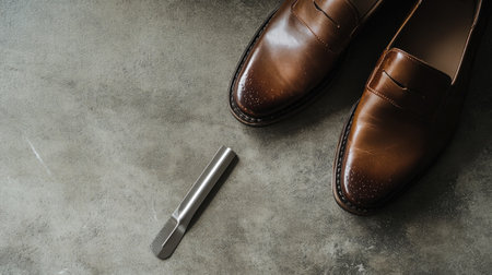 This image features elegant brown leather shoes with a glossy finish alongside a polishing tool on a gray background, perfect for fashion and lifestyle themes.