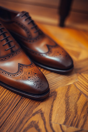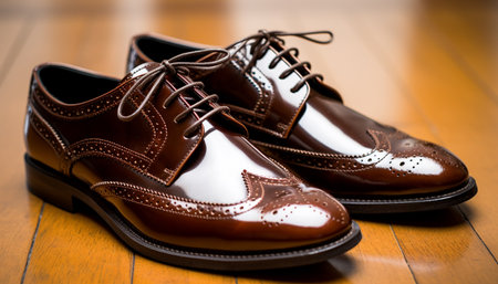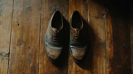 This image features a luxurious pair of brown leather dress shoes resting on a rustic wooden floor, showcasing intricate details and classic elegance ideal for fashion-related projects.