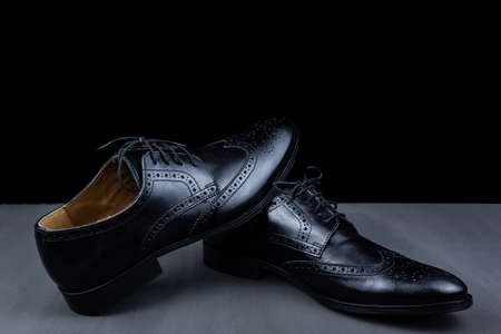 Pair of black shoes on a black background. Men's fashion shoes. Classic men's shoes made of genuine leather. Men's accessories. Elegant stylish shoes