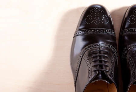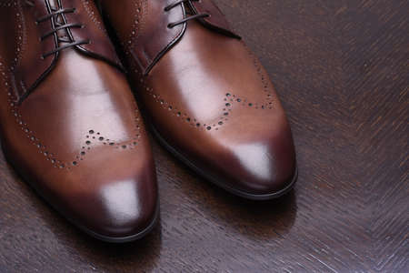 Men's leather shoes on the wooden floor. Shallow depth of field