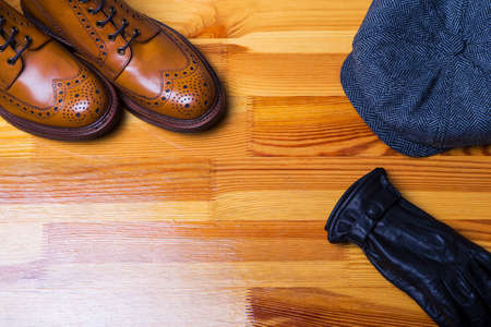 Clothing Concepts. Upper View Flat Lay of Tan Brogues Boots With Winter Cap and Leather Gloves on Wooden Surface Background.Horizontal Image