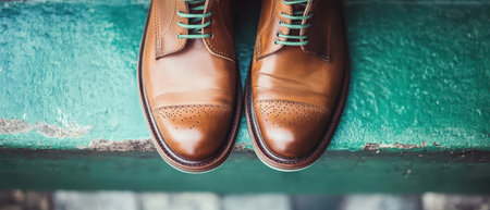 Brown leather shoes are placed on a worn green bench in an outdoor setting showcasing their elegant design and craftsmanship.