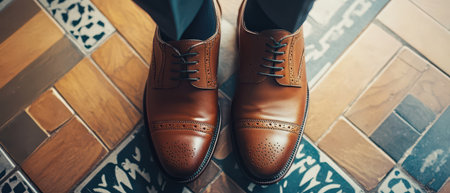 Brown dress shoes with intricate detailing rest on a colorful patterned floor. The stylish footwear enhances the overall aesthetic of the setting.