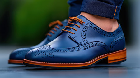 A man showcases his fashionable blue brogue shoes while standing outdoors.