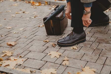 Hands tie a thin lace on a stylish left brogue shoe in autumn park close-up. Nearby is a brown leather carpetbag