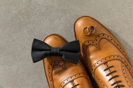 Groom wedding day background. Leather shoes bow tie and rings