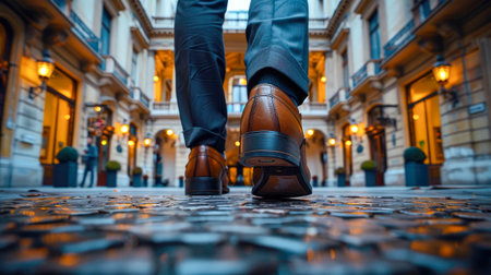 Close-up of a mans polished brown formal shoes ascending a flight of concrete steps, symbolizing progress and determination