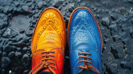 a pair of shiny shoes next to a puddle, creating a reflection, created with generative ai