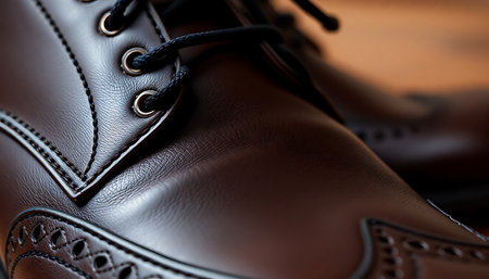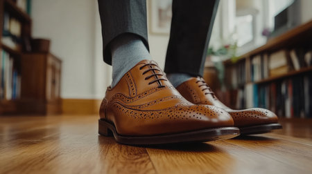 Stylish brown brogue shoes with intricate detailing showcase a refined appearance, perfect for formal or business settings, set against a warm wooden interior.