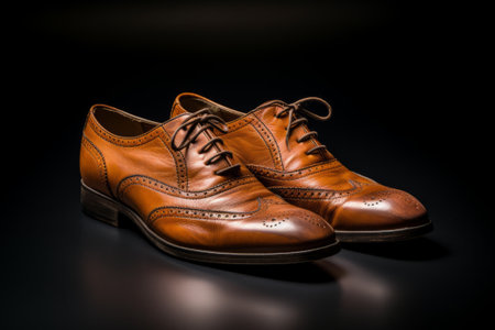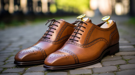 brynmor and brown wingtip lace up oxford shoes and brogues, inspired by the caffenol developing technique, showcase a captivating blend of light brown and light amber hues. this uhd image captures their neoclassical symmetry, accentuated by smooth lines, creating an alluring snailcore aesthetic. ai generated