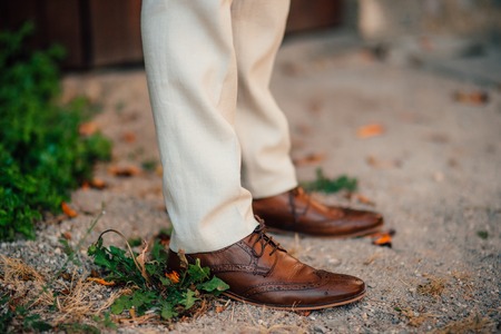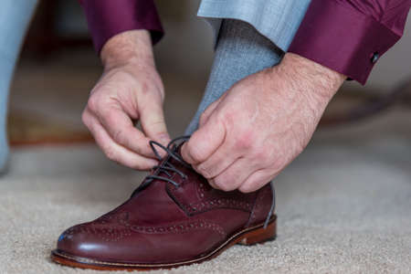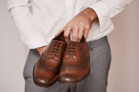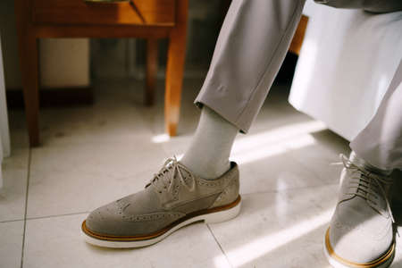 Brown leather shoes. Groom getting ready for the wedding. Wearing clothes background. Dressing up male fashion. Gray fluffy carpet clothing detail.
