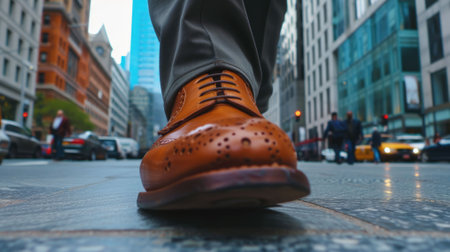 Close view of men's leather boots of a businessman in a big city.