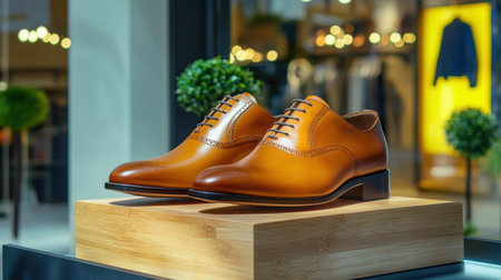A polished pair of elegant brown leather dress shoes showcased on a wooden stand in a boutique. The stylish display highlights the craftsmanship and luxury of the footwear.
