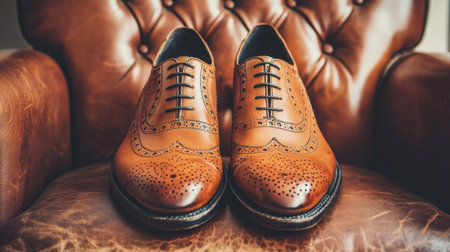 Vintage oxford shoes with intricate details displayed on a leather chair.