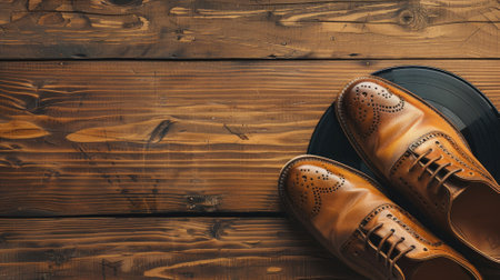 Brown brogue shoes on wooden surface with vinyl record