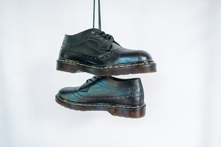 Full black wingtip brogue shoes with rubber sole hanging by laces on a white background. Nice details of premium quality handmade classic shoes made by local artisans
