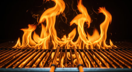 A close-up image captures the mesmerizing dance of vibrant flames on a grill. The fire, with its intense orange and yellow hues, contrasts sharply with the dark background. The grill's metal grates are visible beneath the flames, adding texture to the scene. The image evokes a sense of warmth and the primal allure of fire.