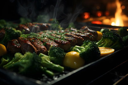 Grilled beef with broccoli and lemon on a black background. Toned.