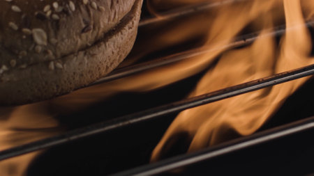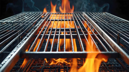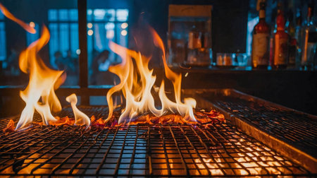 A background of flames rising from a grill, with intense heat and bright colors creating a dynamic and powerful scene.