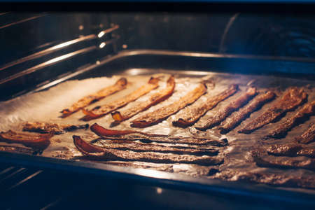 Sliced carrots in the oven on a protvin for cooking carrot bacon. Vegetarian food, meat replacement, vegetable protein
