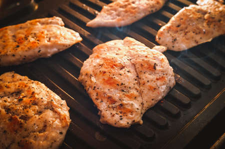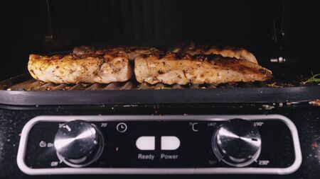 Roasting Fuming Chicken or Turkey Meat Fillets Seasoned with Spices on Electric Grill Plate.