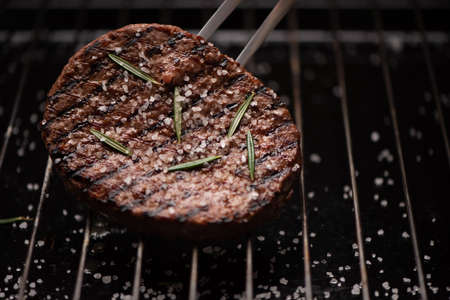 american food. The concept cooking meat. pieces of beef steaks from grill. concept cooking meat with smoke, spices and rosemary.