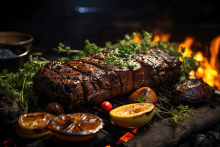 Grilled picanha with fresh herbs, in an outdoor barbecue with live music and party lights., generative AI