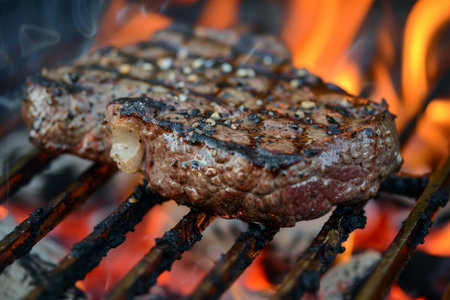 A tantalizing scene of juicy steak cooking over an open flame on a grill, with vibrant flames and glowing charcoal, perfect for summer gatherings.