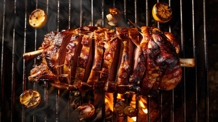 Whole roasted suckling pig on a barbecue, captured from above, with perfectly crispy skin. Great for festive and gourmet food photography.
