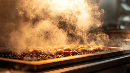 Steam escaping from the exhaust of a cooking grill, with the smoke and steam mingling to create a dynamic and appetizing culinary scene.