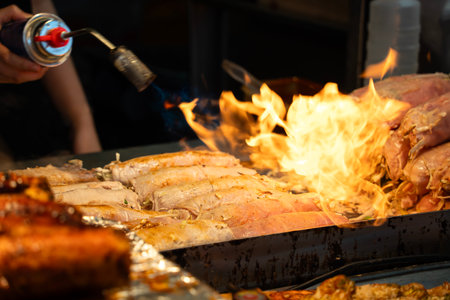 Grilling barbecue meatloaf rolled with vegetables, pork or beef at traditional night market stall, delicious street food in South Korea.
