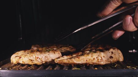 Delicious juicy meat steak cooking on the grill. Cook grilling fresh chicken breast. Fry chicken fillet on electric roaster. Pour salt, rosemary, black pepper. Slow motion.