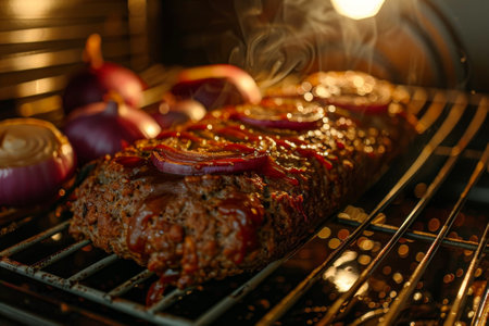 A meatloaf cooking in the oven with ground beef, ketchup and onion