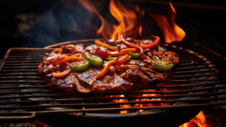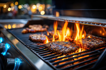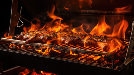 Flames dance above a grill filled with sizzling meats capturing the essence of a vibrant backyard barbecue on a warm summer evening surrounded by friends and laughter.